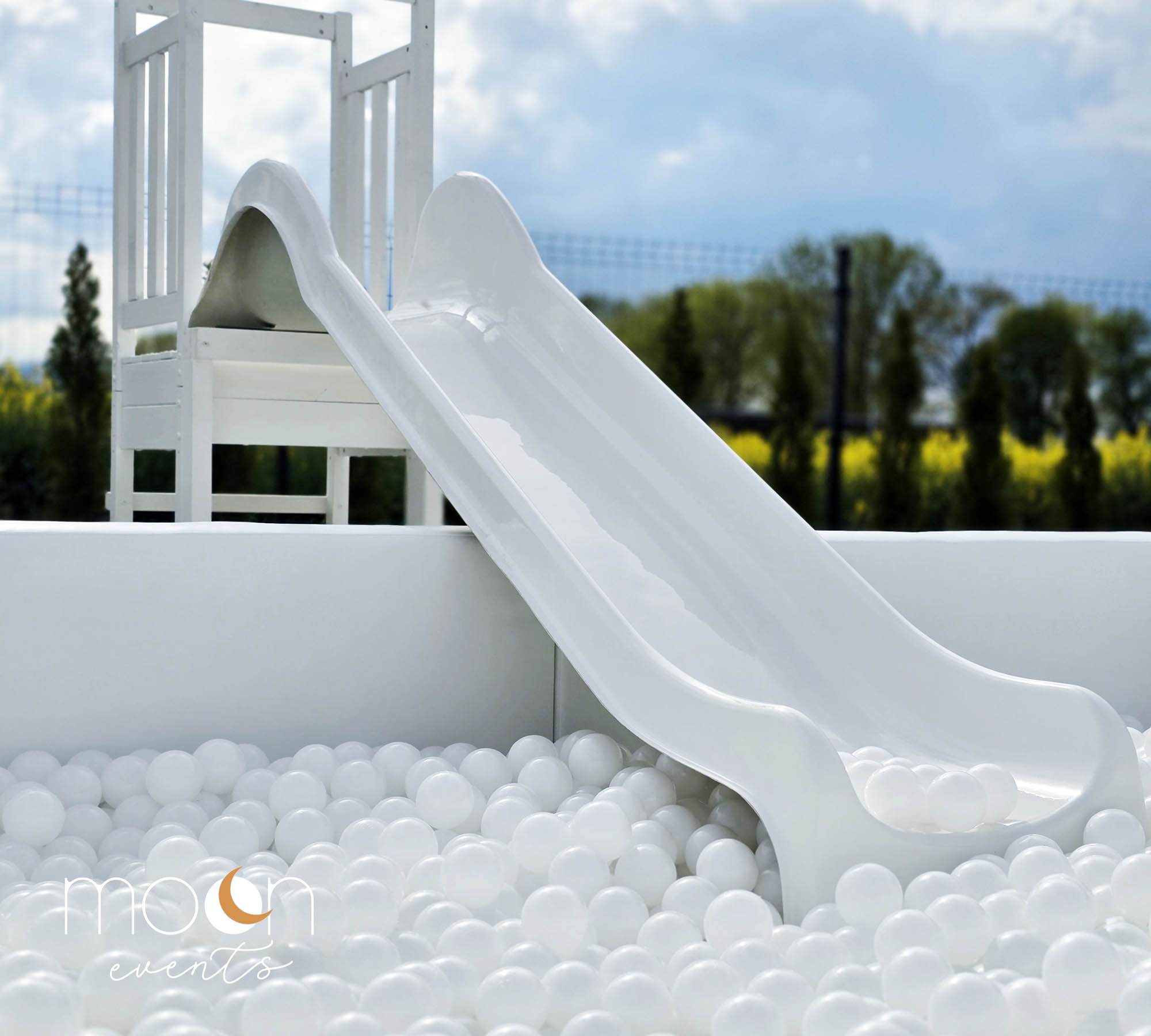 Moon Pool to nasza wyjątkowa atrakcja stworzona z myślą o maluchach. Biały, elegancki basen o wymiarach 3×3 metry wypełniony aż 5000 kulkami to miejsce, w którym dzieci mogą bezpiecznie się bawić, skakać i zanurzać w morzu kulek.